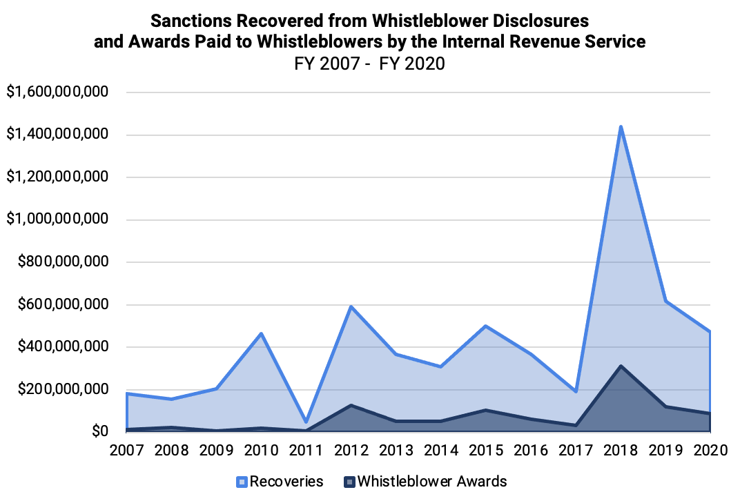 Between 2007 and 2020, over $5.9 billion has been recovered by the IRS, while over $1 billion has been awarded to whistleblowers.