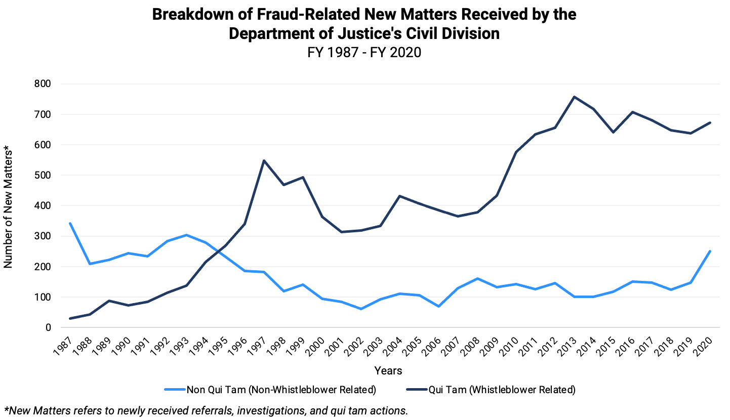 - The number of qui tam lawsuits has grown significantly, with 672 qui tam suits filed in FY 2020 – an average of 13 new cases every week.