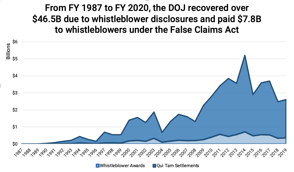 - Whistleblower cases under the FCA have brought in $46.5B to the U.S. Treasury through FY 2020. Of that amount, $7.8B was paid in rewards for whistleblowers.